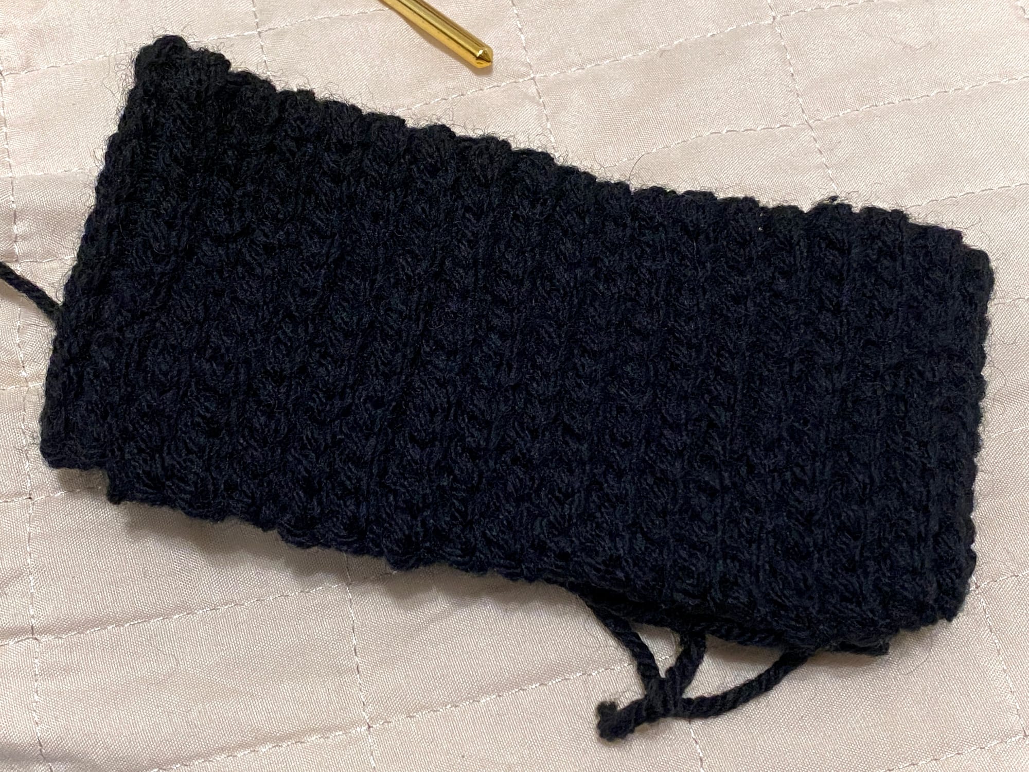 This is working up smoothly and I like it. I'm working with a moss stitch. I've used it in clothing before, in the only proper clothing item I've ever worn out and enjoyed making use of. Four increases every other round, two increase stitches per increase (due to the nature of the stitch). I've crocheted 16 rounds, excluding a single crochet round in transitioning from the neck.