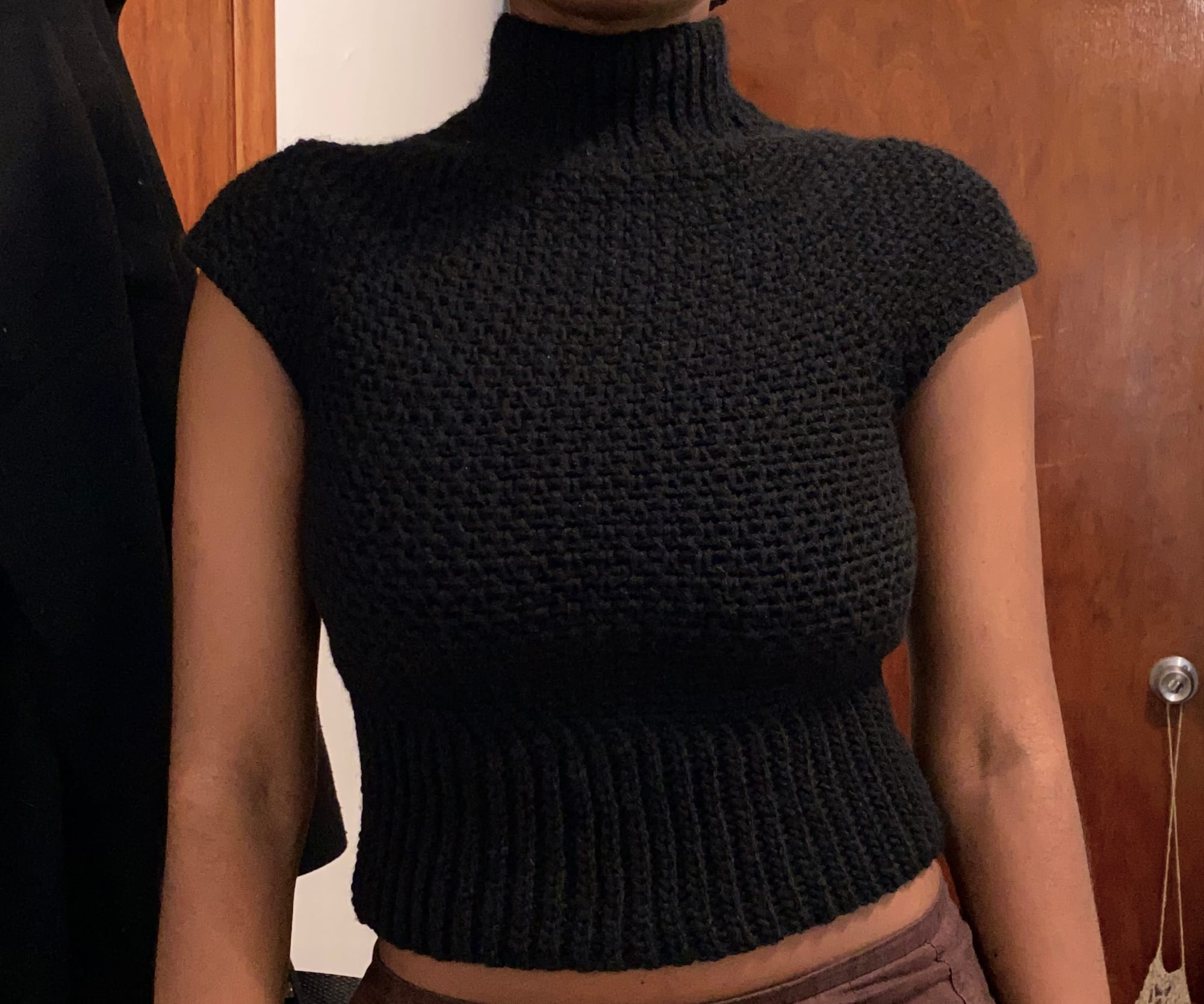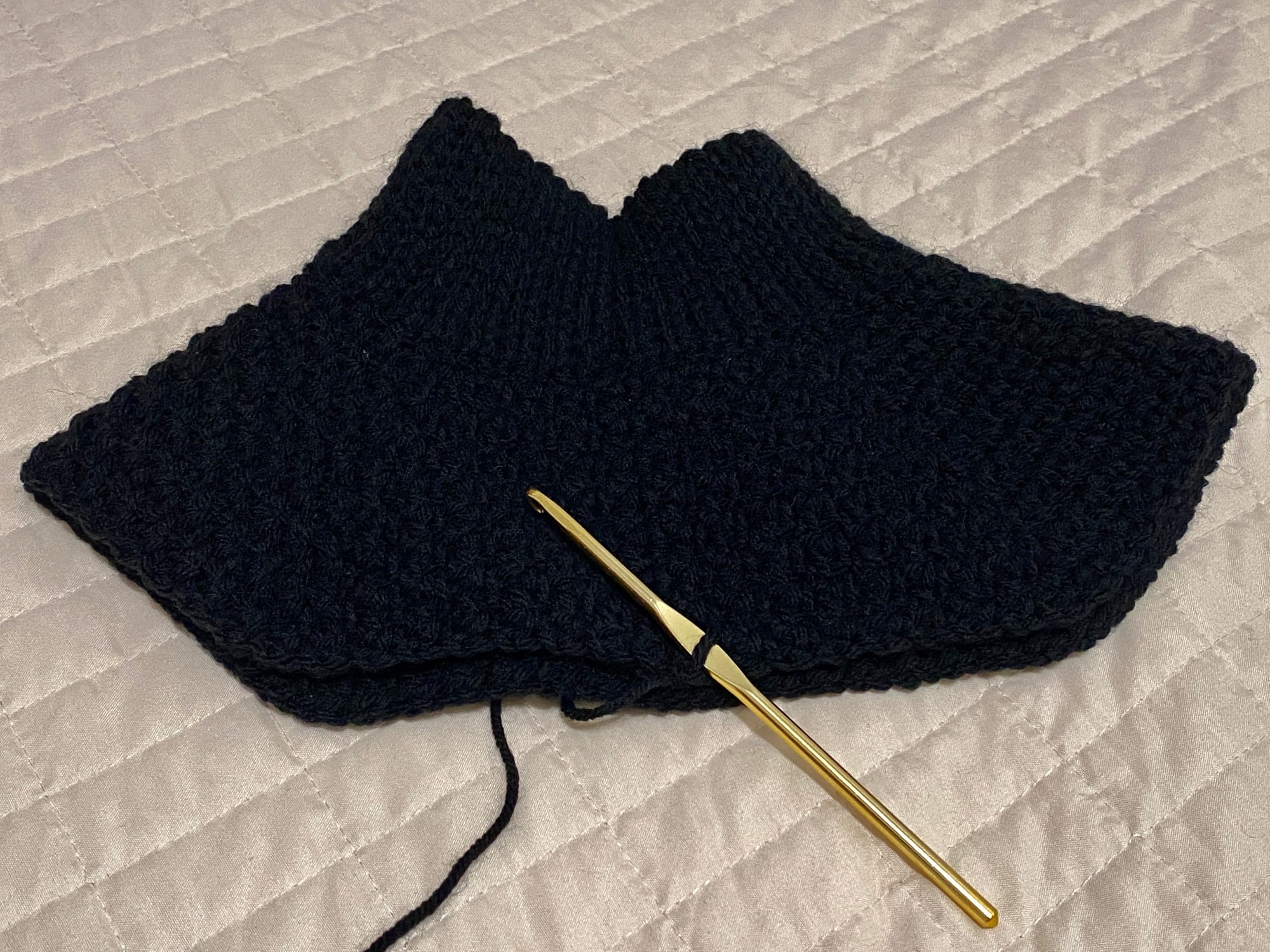 - The unravelling: for a while there was rippling around the collarbone I wasn't pleased with. I'm intent on having this be genuinely wearable, not just tolerable, so I considered adding an extra increase to the mid-shoulder before transitioning to 4 inc per round (on avg.) since I know 4 inc per round in sc crochet gives the exact angle I desired. The rippling and pulling up was also exaggerating another issue: the front of the collar is quite high, higher than intended in design. Note— while it may be useful on a shorter collar, the neck increases toward the front are not needed when working the ribbing. I considered unravelling the whole project to remedy this, but once I figured out aligning the armholes and pulling the front down, it was smooth. I worried about it pulling up again over time, but I've tried the sweater, worn it a bit, and this wasn't an issue. In future, still, do not work the increases on the neck, if anything, consider a small decrease.