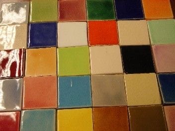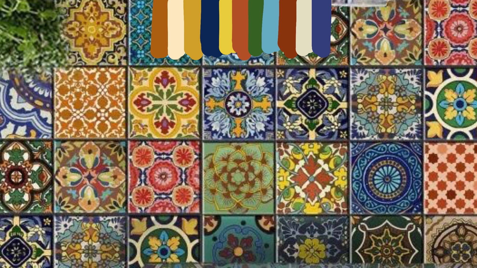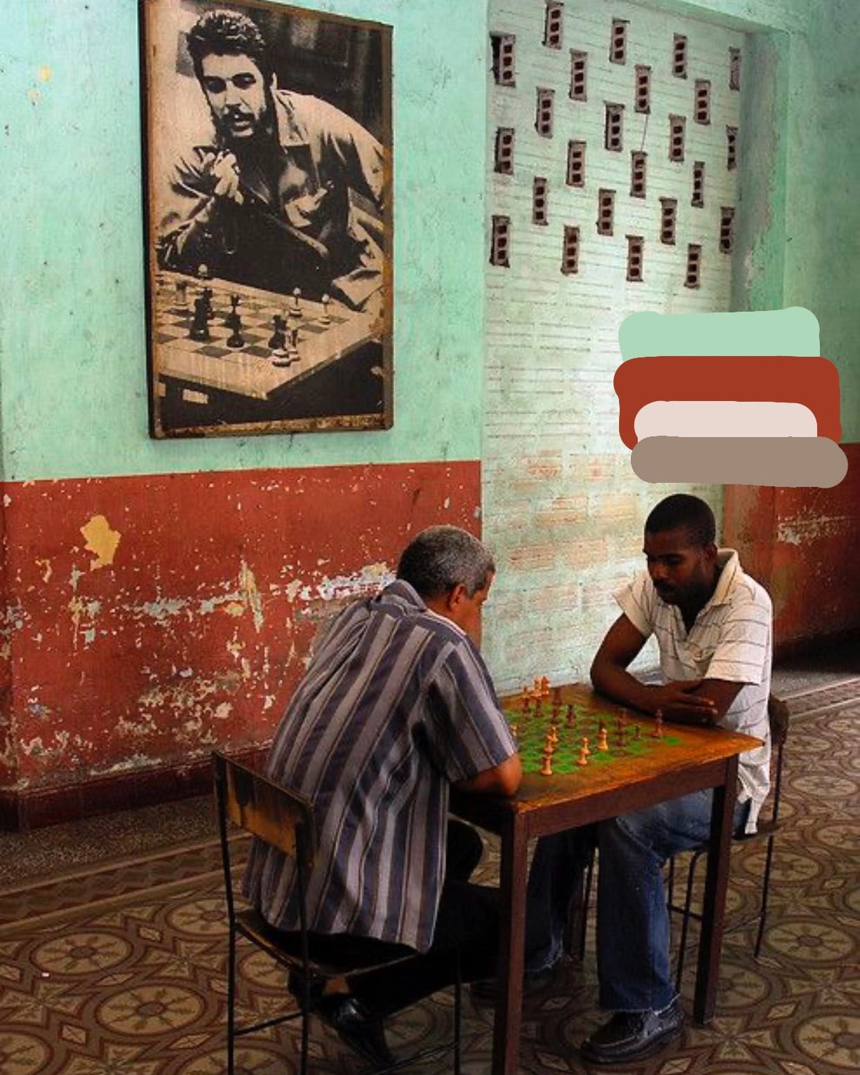 Tile origin unknown; Image with Mexican textiles; a game of chess in Cuba