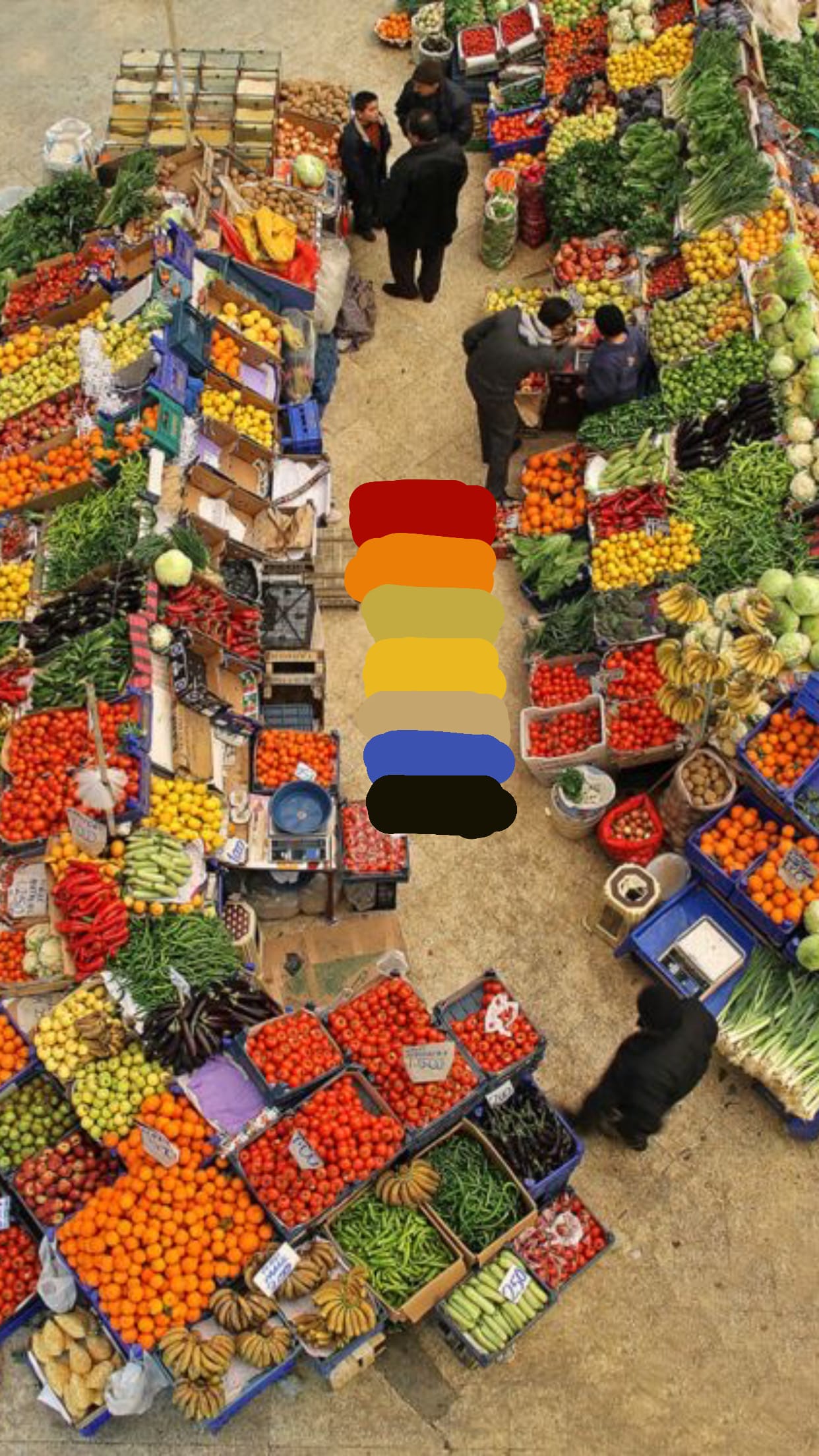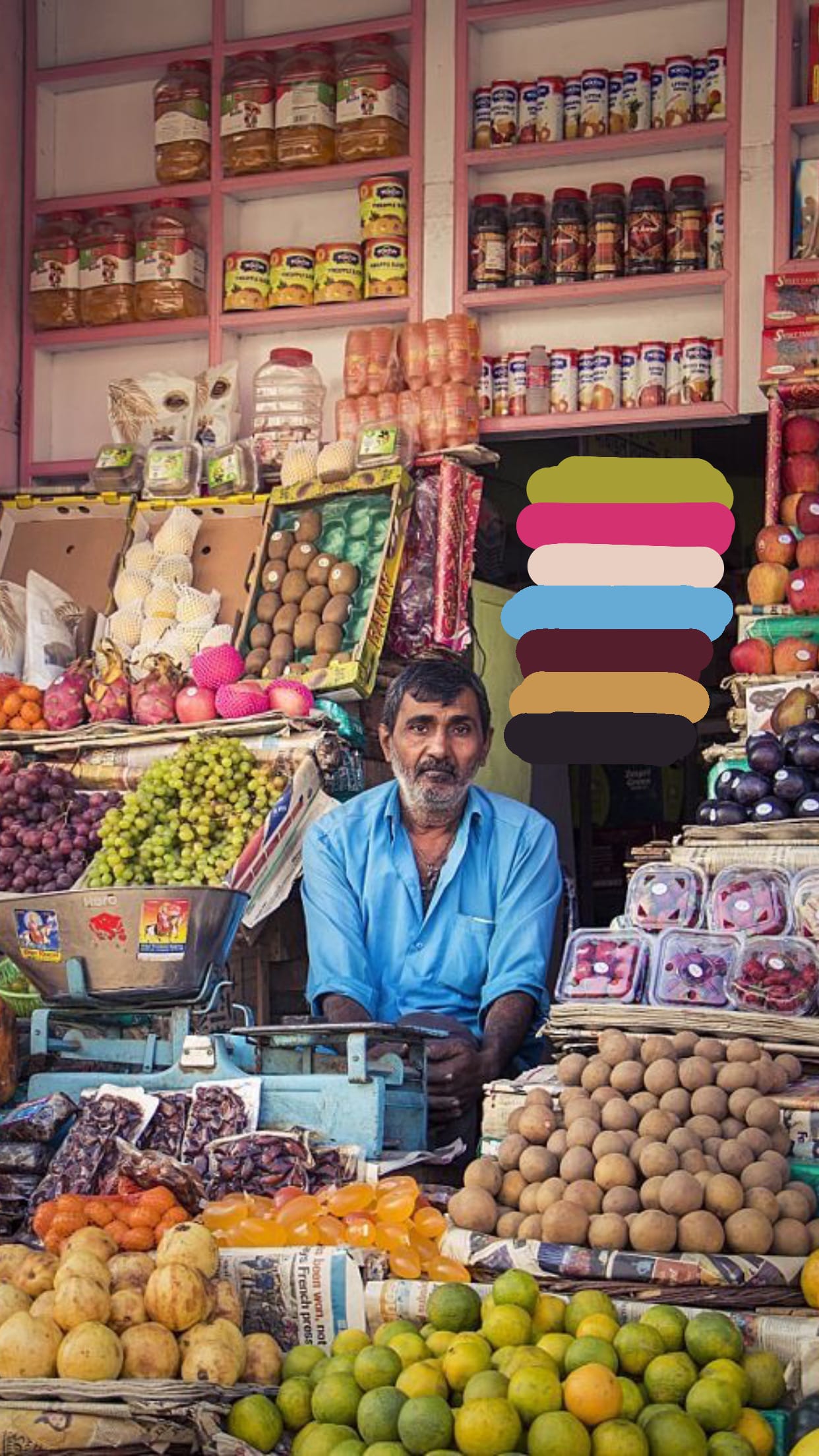 If you want to create something with lots of variation, maybe to mimic a scrappy shirt or a patchwork sweater, it can be difficult to select colours and know how to pair them well. For bright colours, perhaps look at a fruit stand or a coral reef [note these tend to be warm-toned]. If you want something more balanced and comforting, try looking at plates of food; you'll find greater incorporation of neutral tones here. If you want to call back to the first guiding thought, find candid or casual photographs of places that feel imbued with personality and the personal tastes of the people that occupy them.