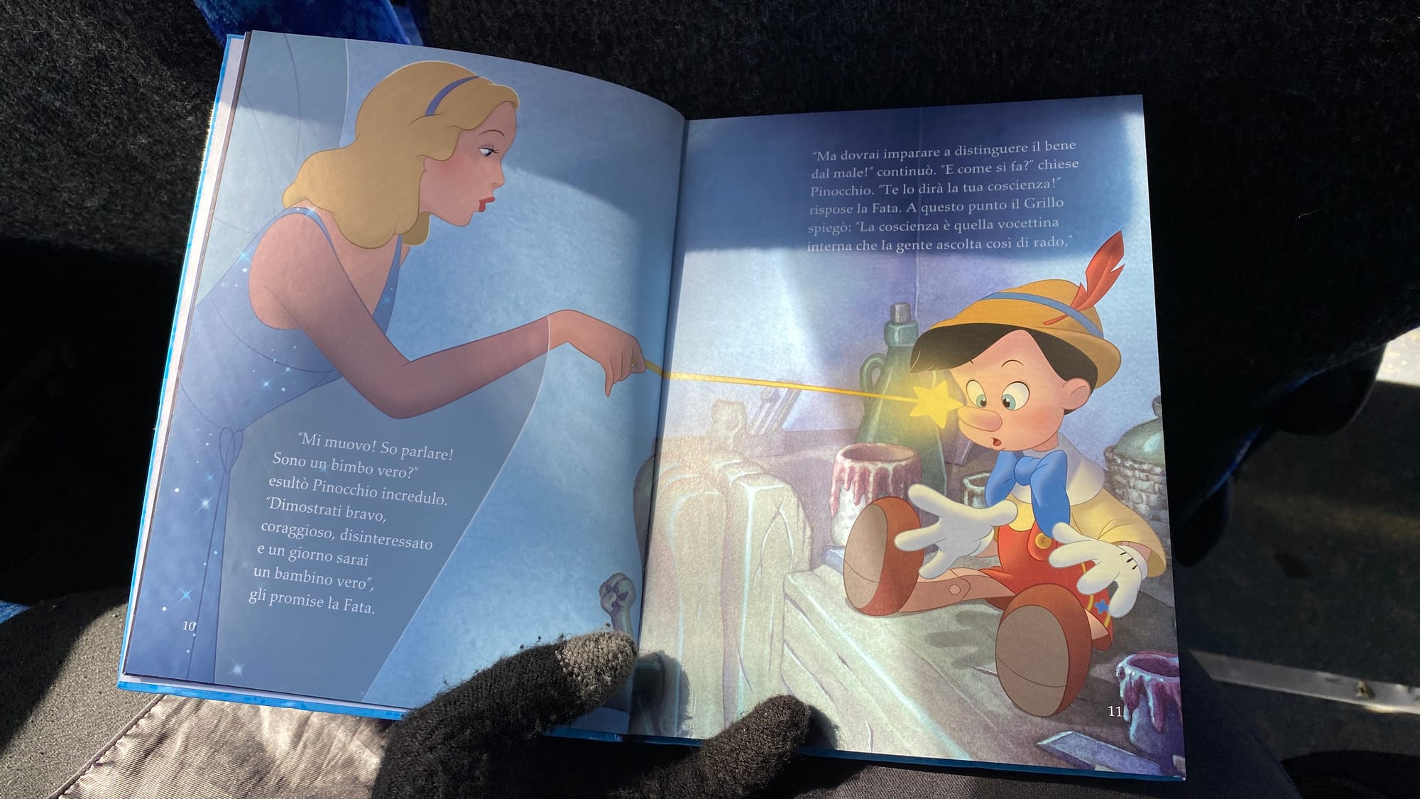 Oggi, Pinocchio mi accompagnò a un appuntamento e ho letto un po' sul bus.