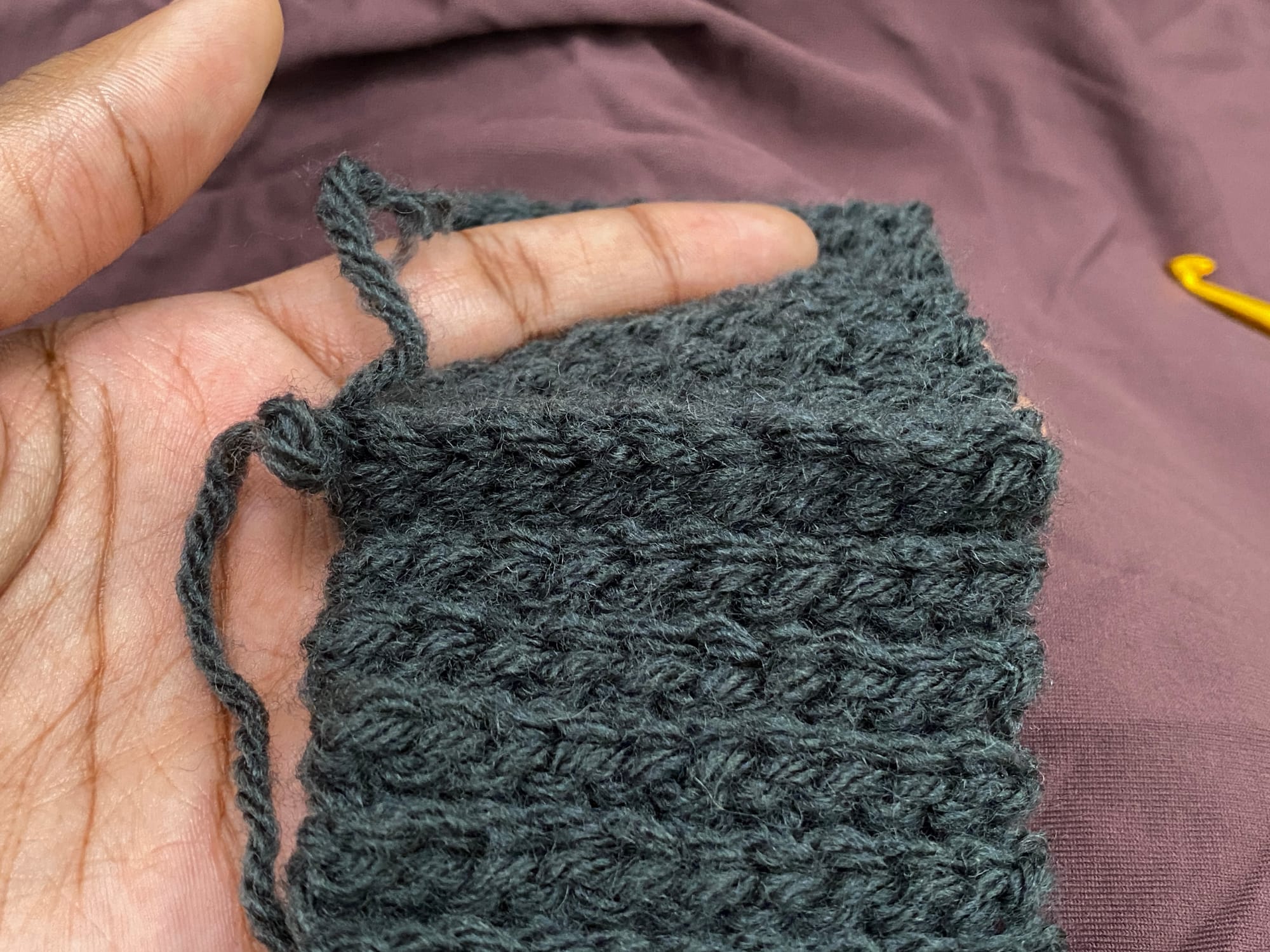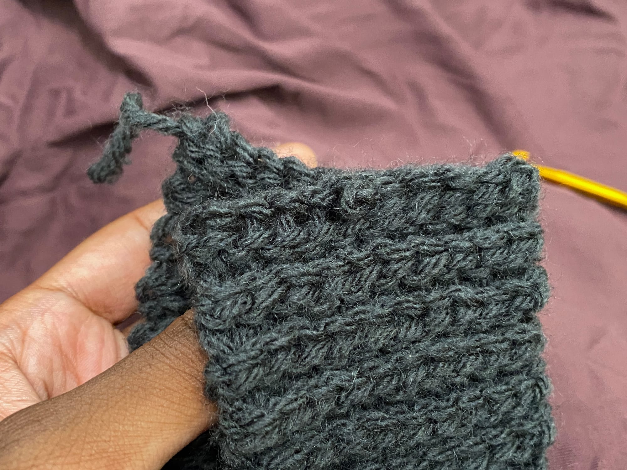 I'm changing the neck, or have changed the neck. Learning from a Thing, the neck needs to be shorter at the front. I want an ideal height of a turtleneck reaching just below my chin, that should be about 7 stitches, but we're working with 8. The back of the neck is 10 stitches. Aim for the decrease to be along the edge, but on the back side (although crocheting, I think of a front side to my work and a back side to my work, the "edge" is where a seam would be or where the edge of the back side would be if sewing fabric). We're aiming for a multiple of 8 at the end, ie. we need to work our neck into 72 rows, 80 rows, etc. Since 76 was used last time, I'm working with a larger hook, this stitch is ribbed and elastic, etc. 80 is probably too large. I'm aiming for 72. I've marked ┅ where edges or middles are.