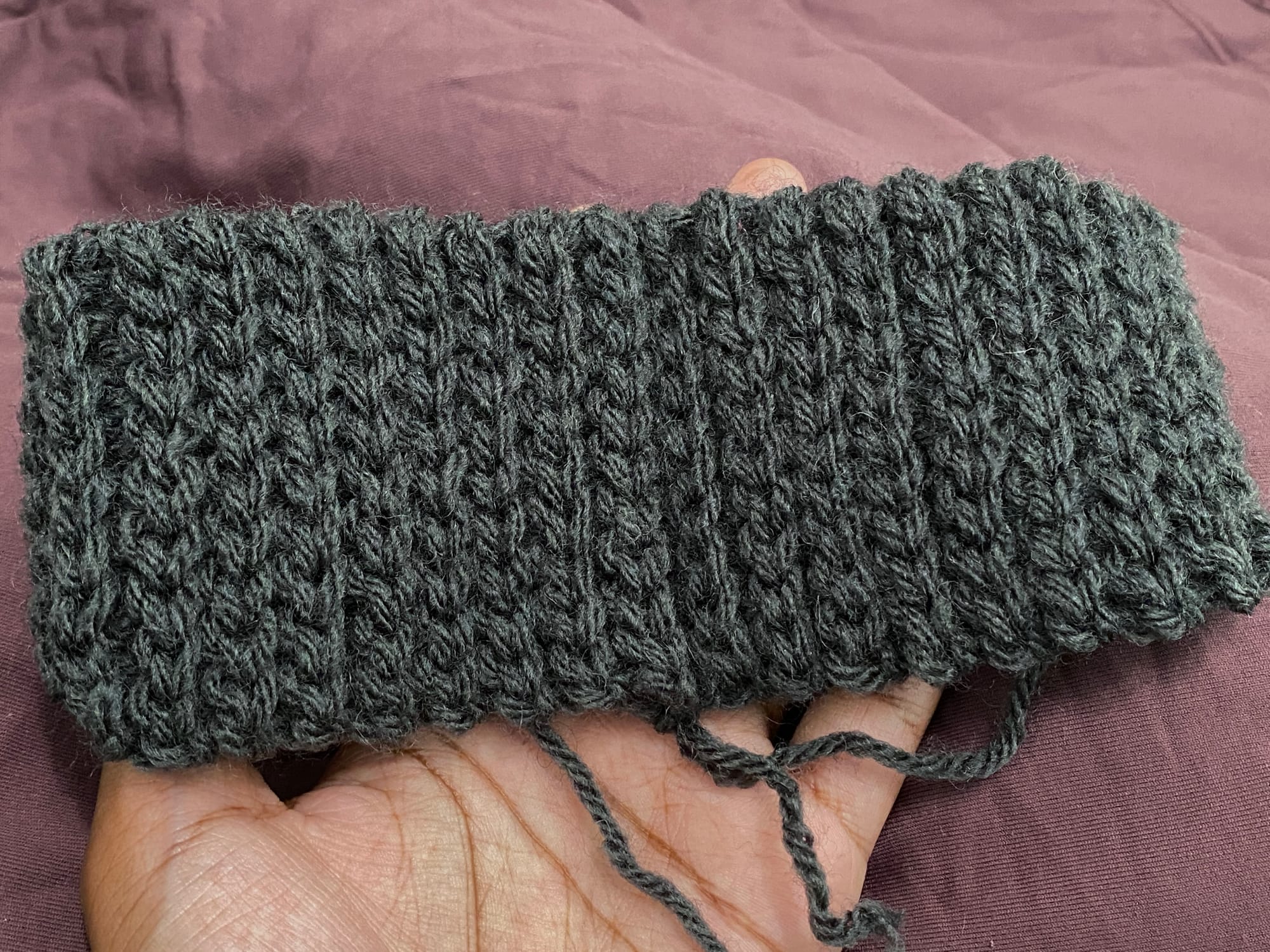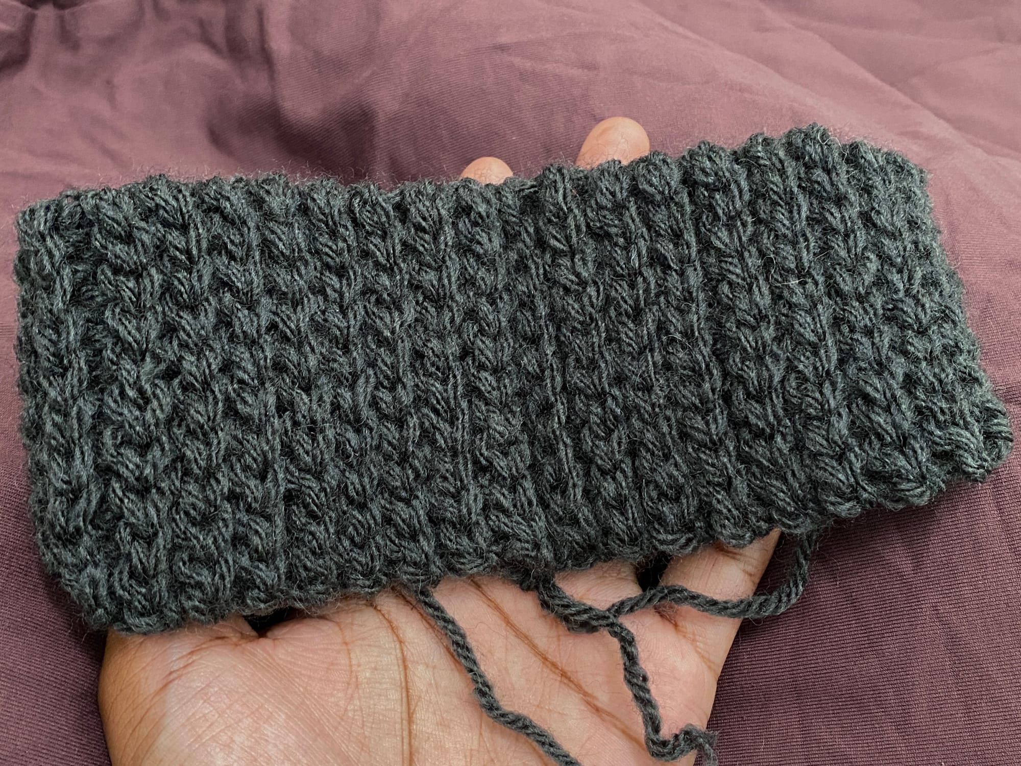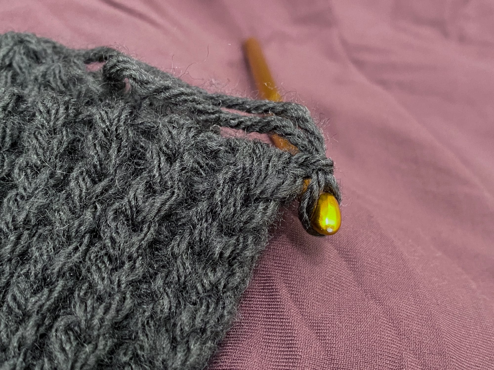 [For the seam, don't flip inside out. Fold work backwards and work through both loops of last row and front loop of founding chain. This will give "invisible" seaming with the "knit" stitches facing upward.]