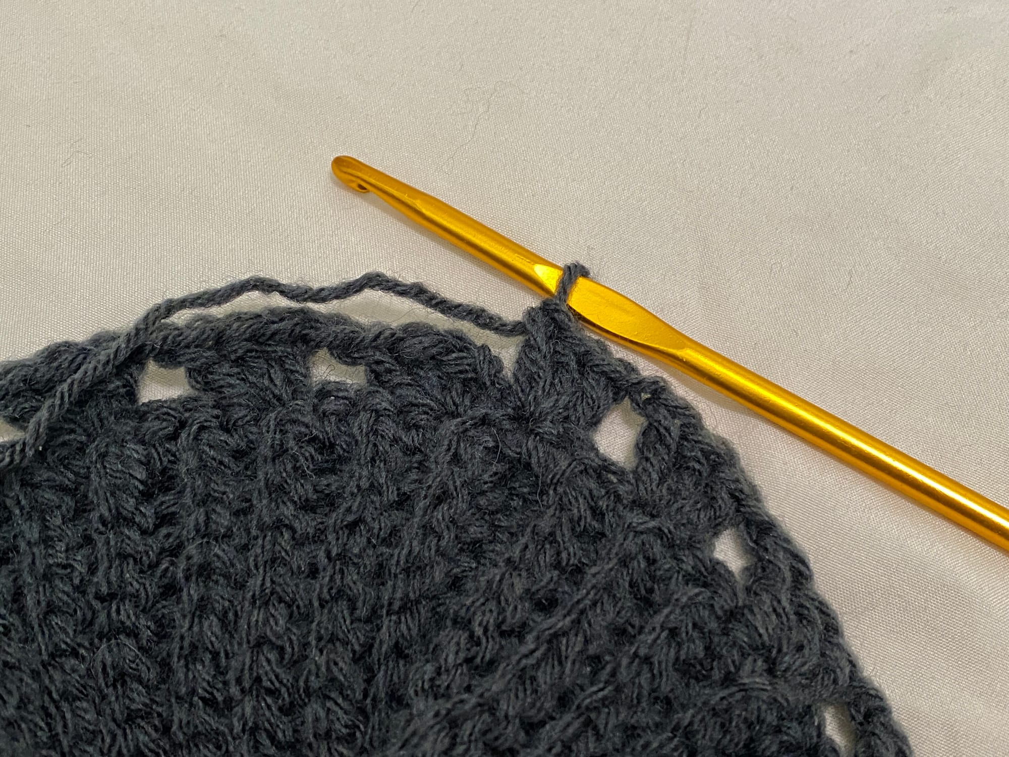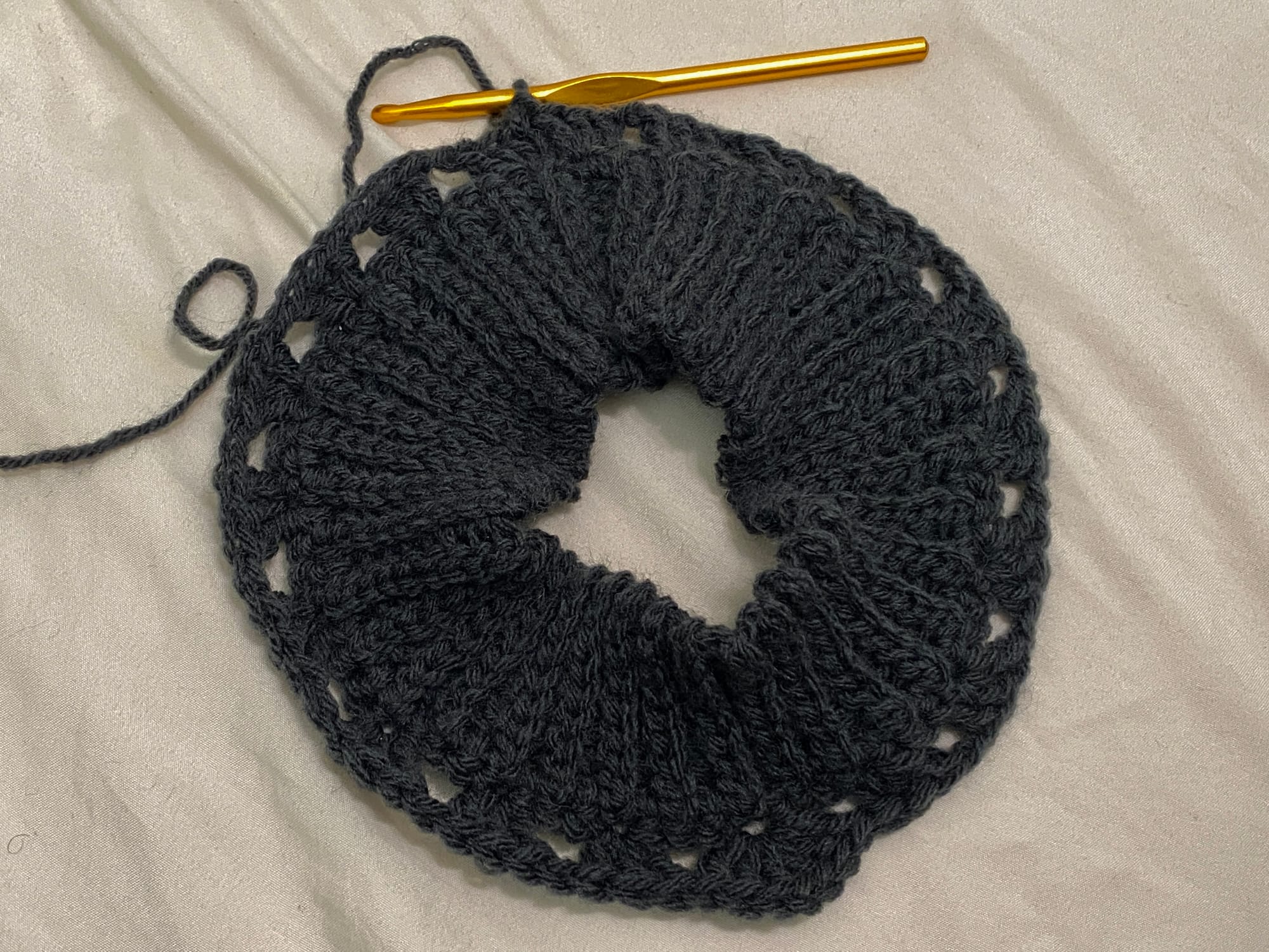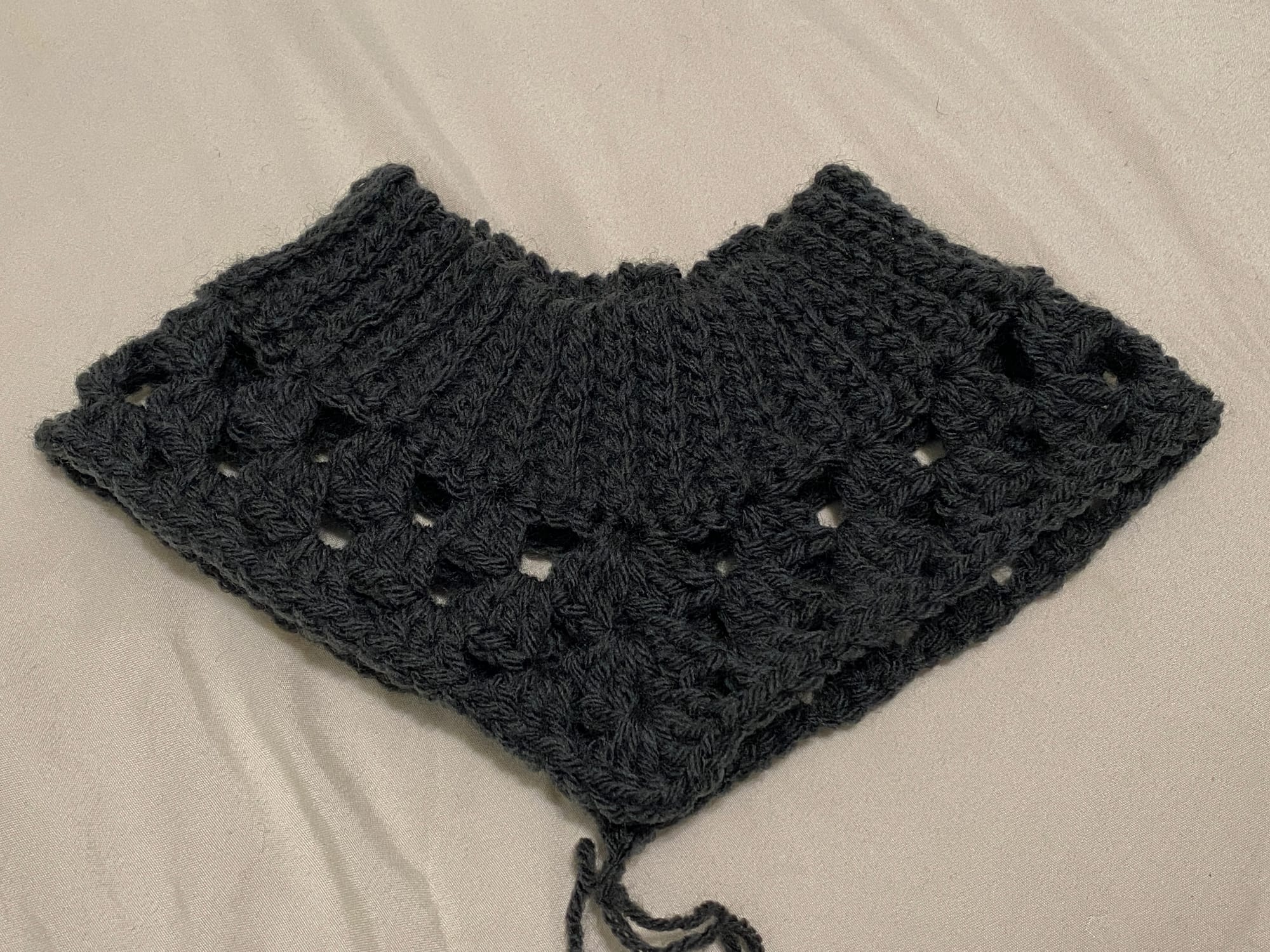 I've worked 3 rounds of granny at which point I was considering switching to solid, but I don't think I can go further with this. I usually size down in hook size and didn't this time, but I don't find this gauge tolerable. I would pretend to find it tolerable and then never actually wear this item or I would wear it and be constantly adjusting it as I did, so I'm unravelling. [:25:58.]. I will say the height of the neck is perfect, so in sizing down, I'll keep that the same. [:27:16.]