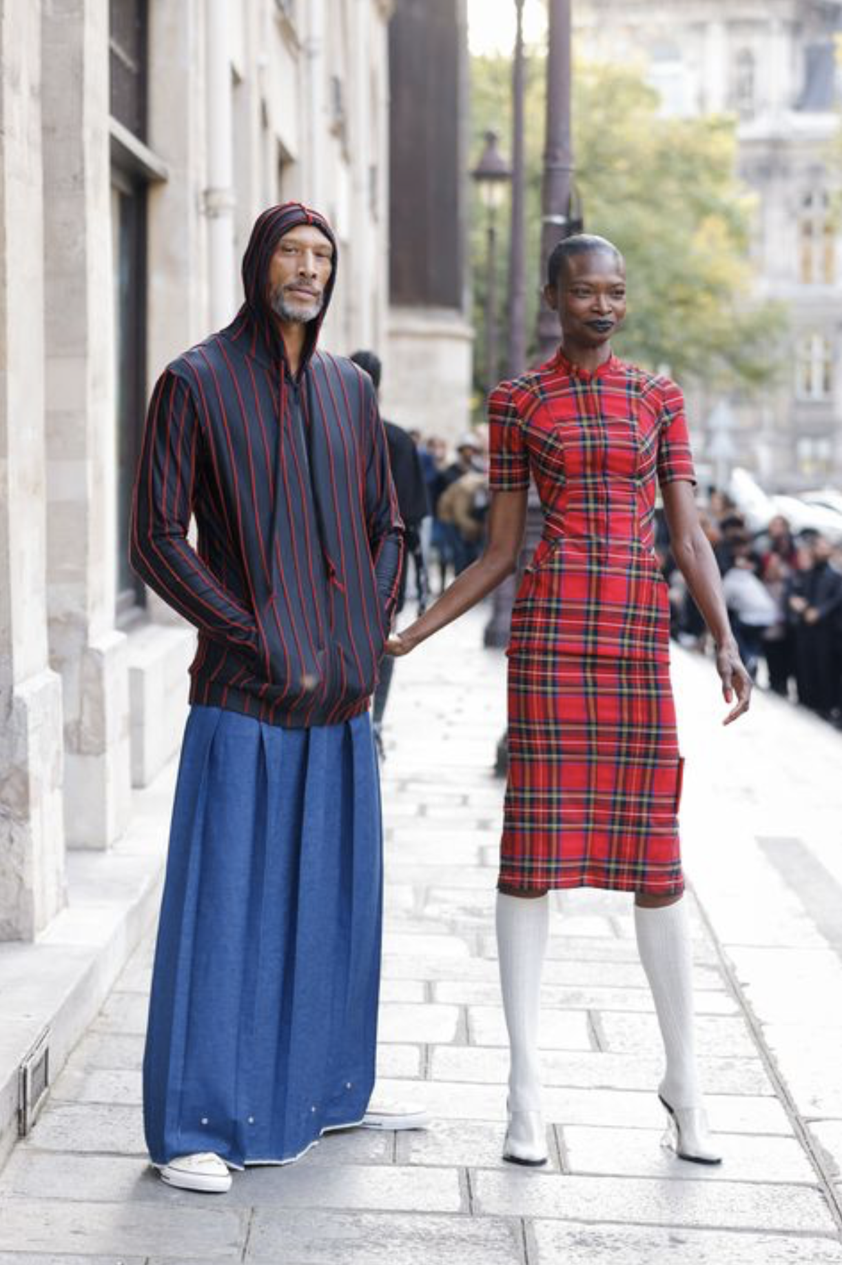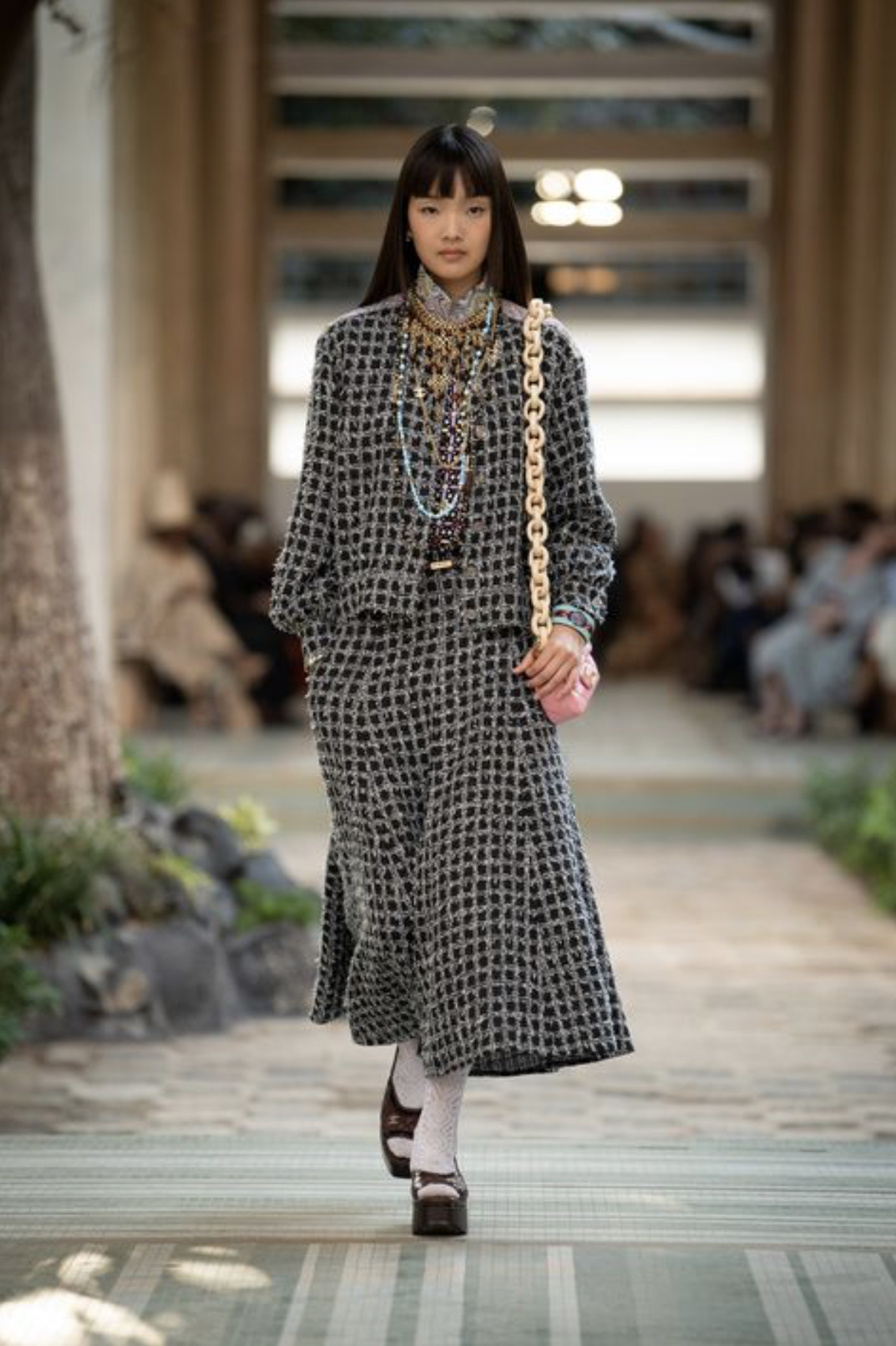 - Long layers & low hems; athleisure with floor-length pleated skirt