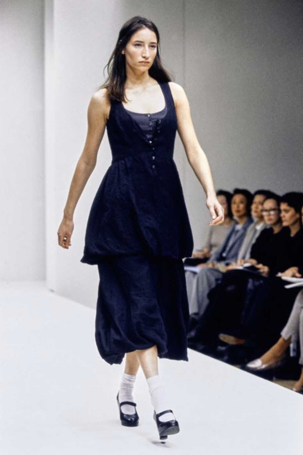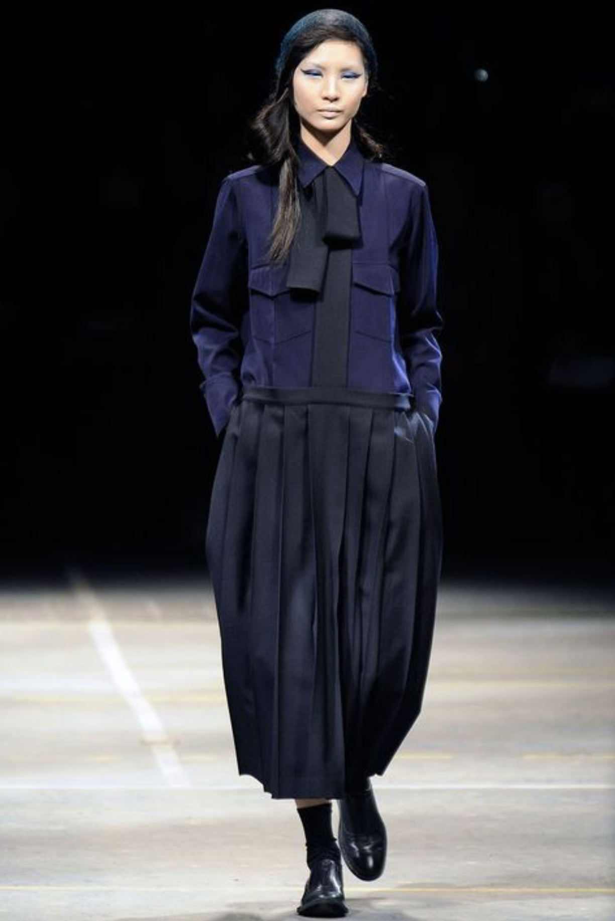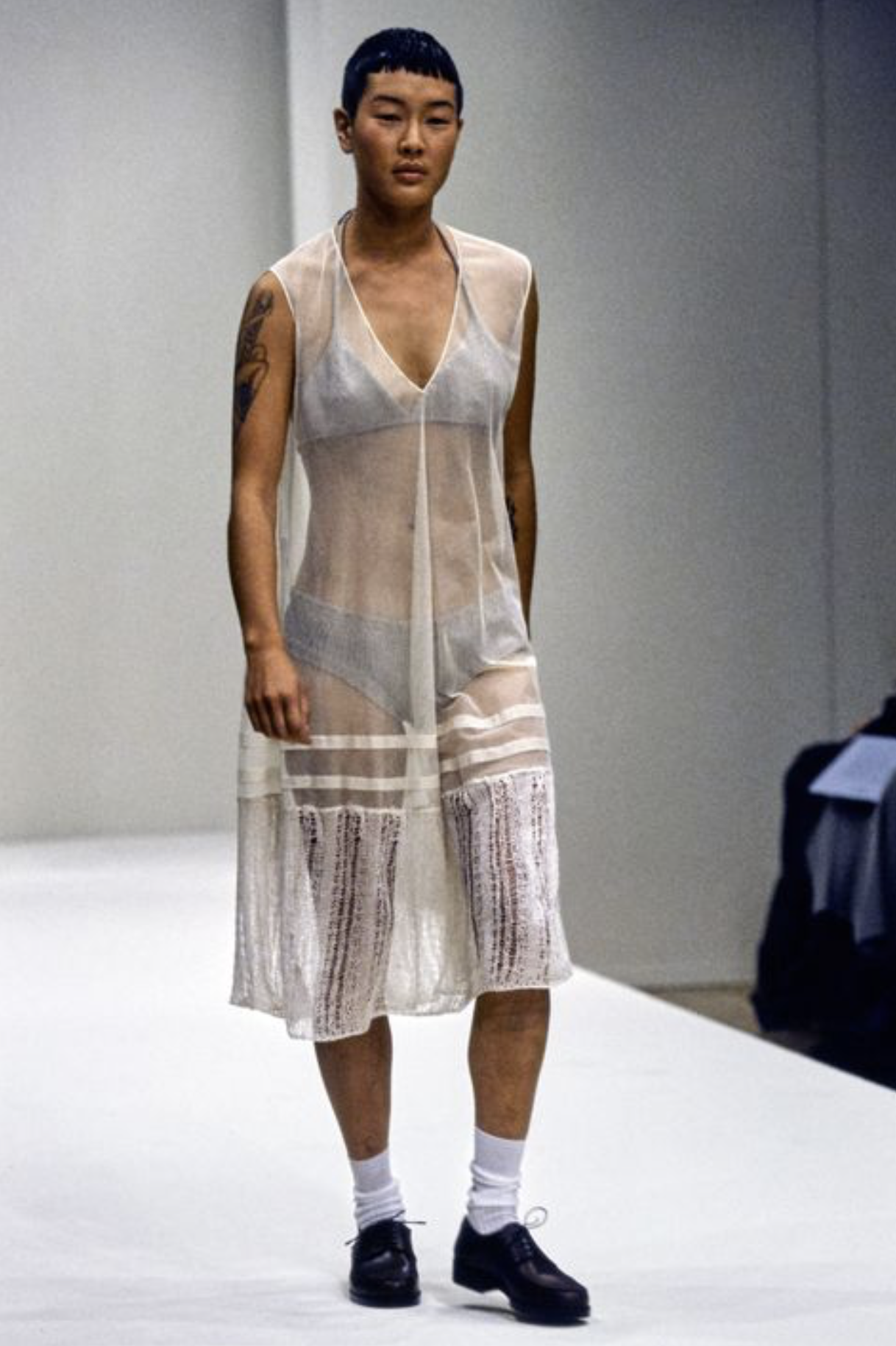 - See-through dress with short hair (or pulled up tightly), slouched socks, and derby shoes